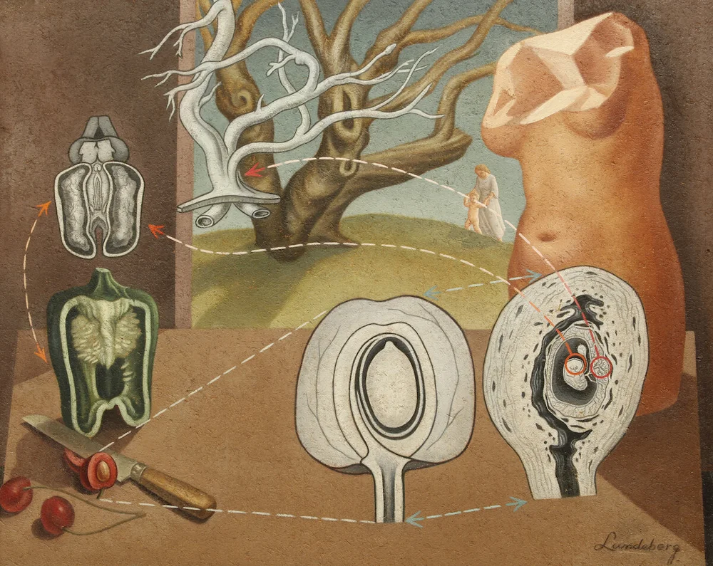 From the Centre Pompidou’s website: “While luxuriant nature occupies a central place in the work of Max Ernst, the Jardin gobe-avion [Eating-plane Garden] series rather gives way to isolated plants that take the appearance of decaying organs. They attach themselves in a disturbing manner to crashed gliders in boxes with deceptive geometry. This agonising image cannot be isolated from the European political context, threatened by the rise of fascism.”
