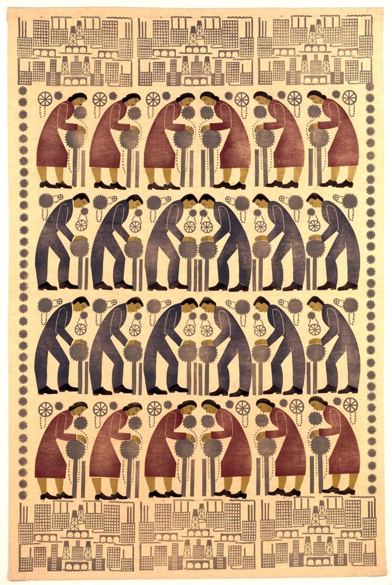 The airplane, perhaps more than any other invention of the early twentieth century, represented the soaring spirit of modernity to the Japanese. It captured the public’s imagination and spirit, and many of the omoshirogara, or novelty textiles, from the 1920s into the 1940s feature airplanes somewhere in their designs, underscoring their importance as modern icons. Perhaps no individual aircraft captured this aura of modernity more than the sleek “Kamikazego” (“Divine Wind”, “Babs” by the Allies), a plane famous for its 1937 transcontinental flight from Tokyo to London to commemorate the coronation of King George VI. It was the first plane to be built in Japan with all-Japanese technology, and it also set an international aviation record on its flight to London, embodying a nationalistic vision of modern aviation for the country. The superb performance of this Mitsubishi Ki-15 aircraft helped to fulfill Japan’s nationalist dreams of being at the forefront of modern aviation, a goal further enhanced when Mitsubishi based the design and engine of its Zero fighter plane – one of the most effective aircraft of the Asia-Pacific War – on the Kamikaze-go. The distinctive shape and streamlined styling of the Kamikaze-go made it an artistic favorite for textile designers. Although the airplane featured on this kimono carries no identifiable markings, the shape and style as delineated here help to identify it as the famous Kamikaze-go, thus setting the date for this garment as mid- to late 1937. The design offered the wearer the opportunity to celebrate Japan’s standing on both international and national stages as a leader in technological progress, and as a leader in the fashion of modernity as well – something that the modern Japanese woman of the 1930s would welcome.