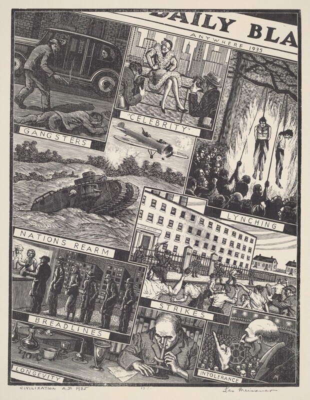 Tonowanda Seneca artist Ernest Smith here ironizes the idea of “Progress,” an ideological alibi for genocide.