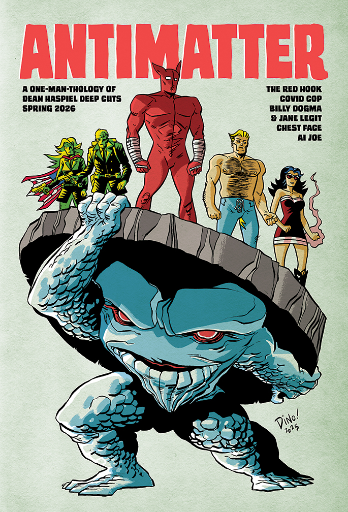 While Tales for the Tall Pines works in multiple directions, Dean Haspiel’s ANTIMATTER anthology comic coalesces into a kind of mini-novel. The trails in and out of the major timeline are twisty, as Haspiel’s stable of creator-owned characters collide in ways we’ve never or not usually seen. And some we have; his mythic archetypes of amory Billy Dogma and Jane Legit are at it again, rocking a lot more than a trailer as their brownstone rattles apart with their tumultuous coupling; luckily Haspiel’s looks-how-he-sounds Chest Face, a standup comedian turned anatomically-condensed mutant powerhouse, happens by; for the rest, you’ll hafta be there. Genetically and technologically engineered US supersoldier AI Joe seeks to override his militaristic program by boffing his computer-brain out with a transistorized soulmate; it doesn’t end well, but it does end nobly. Pandemic post-humans Lincoln Bio and Fate Majeure fight to free one last couple of fertile homo sapiens (don’t ask, just watch) while a clock ticks on our species’ final climax (why help myself?). Along the way faces familiar from the previous pages and Haspiel’s shared and traded universes show up, and the whole book is donut-ed by single-page comicstrip treatments of Haspiel’s ex-boxer/reformed burglar semihero The Red Hook; poignant slices of life that read like one-scene plays. Haspiel’s been cutting his own door with these self-published, crowdfunded “Deep Cut” one-shots, and ANTIMATTER feels like both the redemption of blockbuster corporate event-comics and a reinvention of the anarchic sexual psychedelic underground-comix movement of a bygone but surprisingly kindred DIY age. This book tells us that, despite everything we do, it all matters.